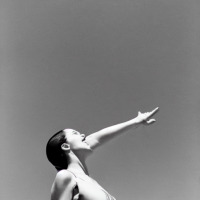 Portrait of a woman in a swimmingsuit, taken with a camera from below.