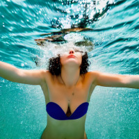 Camera shot of woman in swimming costume from below